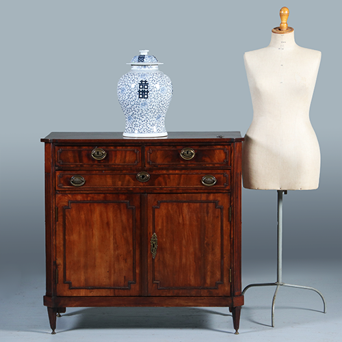 Hollandse 18 e eeuwse louis Seize penantkast met een bijzondere indeling met twee grote en twee kleine laden. Daaronder twee deurtjes met geprofileerde lijsten. Het geheel op kleine tapse pootjes.