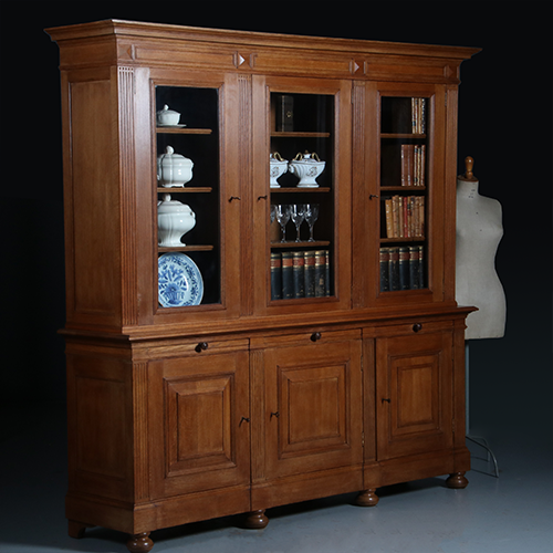 6-deurs Bibliotheek met drie zwart ingelegde tirettes. De kast staat op kleine bolpootjes, daarboven drie deuren met geprofileerd lijstwerk, dan de drie uittrekbare plankjes, zeer praktisch (want je komt toch altijd een hand te kort bij het organiseren van boeken). Vervolgens boven drie beglaasde deuren met daartussen zowel onder als boven platte stijlen met cannelures onder een uitkragende kroonlijst