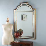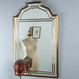 De kroon met een fraaie bokaal waar op zeer weelderige wijze de guirlandes vanaf slingeren naar strikjes waar de spiegel aan lijkt te hangen.