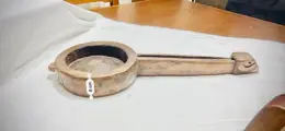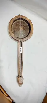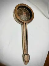 Lange houten pollepel waarvan het handvat een gleuf heeft en aan het uiteinde een klein gaatje om een straaltje water uit te laten lopen voor huishoudelijk gebruik.De pollepel is 57 cm lang en heeft een dikte van 6 cm en een gewicht van 950 gram. Het is in goede staat, vertoont ouderdomssporen, er ontbreken geen stukjes