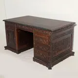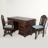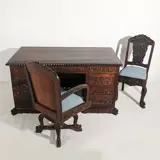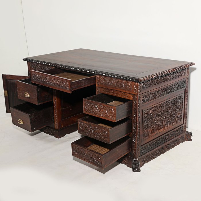 Bureau van gebeeldhouwd sissoohout, met centrale lade en twee zijdeuren, een binnenvitrine met 3 lades. Met sleutels. Stoel en draaibare bureaustoel in gesneden sissohout, met stof beklede zitting. Decoratie met ingewikkelde plantmotieven, voeten in de vorm van een leeuwenkop. Bureau: 78x156x88,5 cm | Stoel: 103 cm | Bureaustoel: 102x56x51,5 cm. In goede staat.