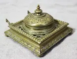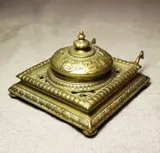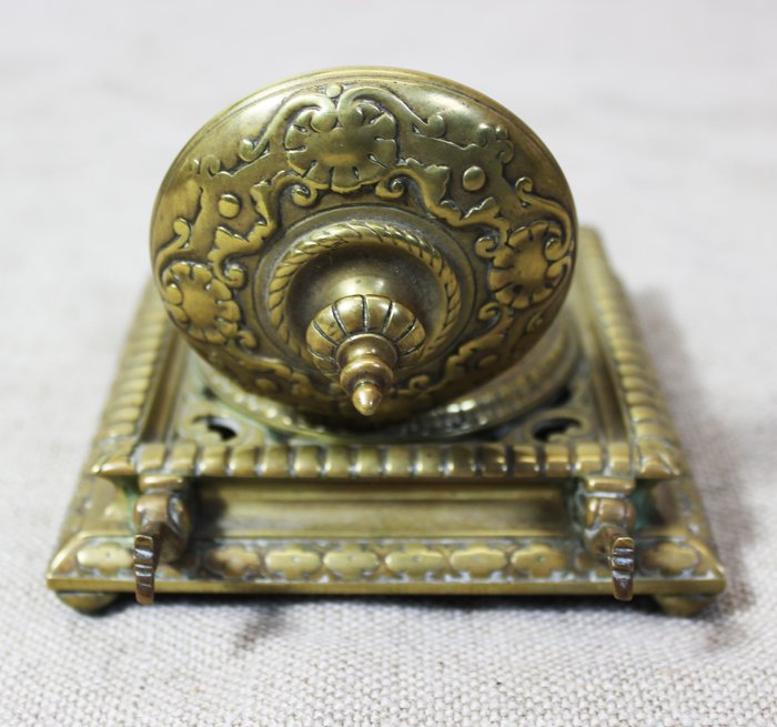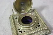 Hier vind je een mooie koperen inktpot met een scharnierend deksel.