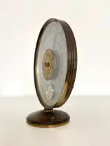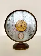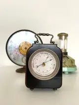 Dit model 7.A.B barometer is gemaakt door de prestigieuze fabrikant Jaeger in de jaren 60. Het kan worden gekalibreerd met behulp van een wiel dat naar de hoogte van de plaats wordt gedraaid. Het heeft ook een thermometerfunctie in werkende staat