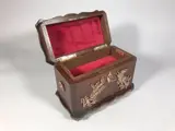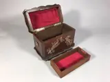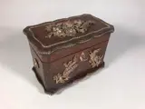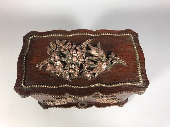 Eikenhouten sieradenkist met koperkleurig metalen beslag van jachttaferelen en bloemen. Het geheel met messing randen en idem pootjes. Het interieur met een uitneembare bak. Inclusief sleutel.