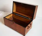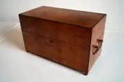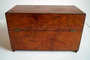 Juwelenkistje van hout met uitwendig fineer in bruyère en gezwarte profielen, metalen handgrepen en slot met originele werkende sleutel.