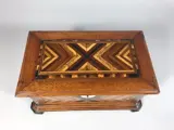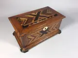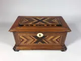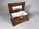 Mahoniehouten sieradenkist met inleg van diverse soorten fijnhout. Het interieur met spiegel en bekleding van later datum.
