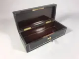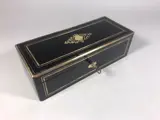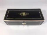 Gezwarte houten sieraden- of handschoenenkist met messing inleg en palissander gefineerd interieur. Inclusief sleutel.
