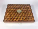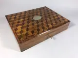Notenhout gefineerde sieradenkist met parqueterie van palissander en rozenhout. Het interieur met diverse vakken en uitneembaar bakje. Inclusief sleutel.