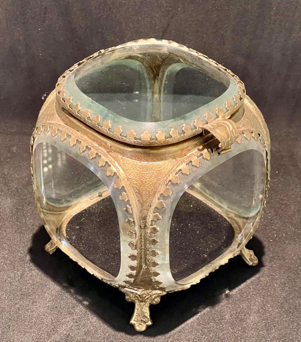 Charmante grote oude venster vitrine of juwelenkistje in facetgeslepen glas en fijn gesneden verguld messing met verfijnde versieringen. Vernieuwde zwart velour bodem