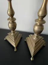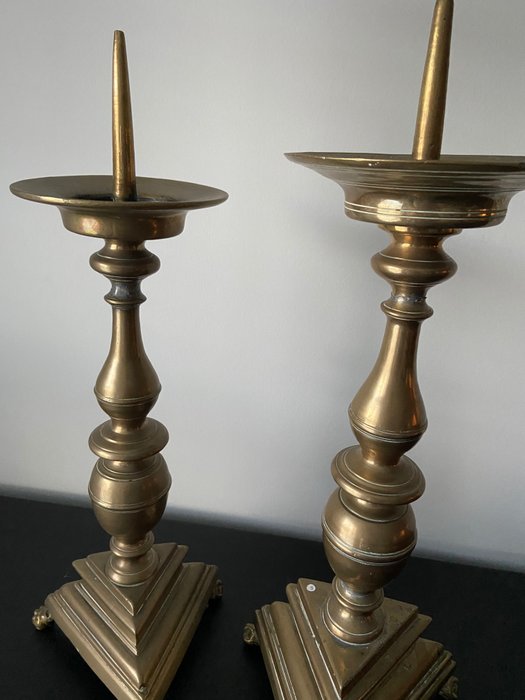 Twee grote bronzen penkandelaars met balustervormige stam op pootjes. 17e eeuw, hoogte 56 en 58 cm.