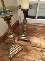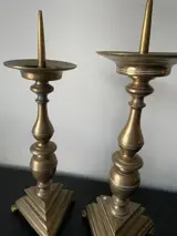 Beide kandelaars hebben over de jaren enkele beschadigingen/restauraties gehad zie foto’s om een beeld te vormen. Heeft echter geen invloed op de stevigheid van de kandelaar.