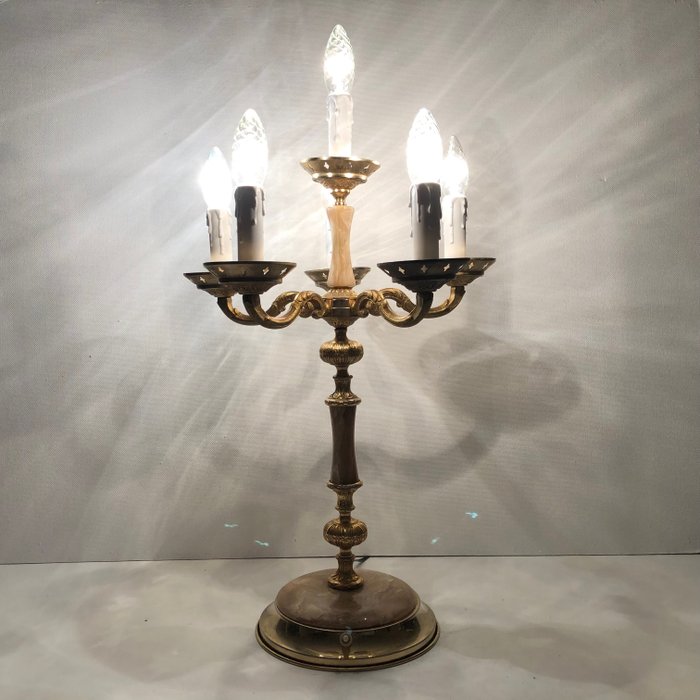 Uitzonderlijk mooie vijf armige kandelaar met messing beslag en marmeren ornamenten.