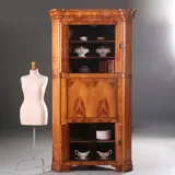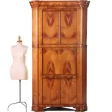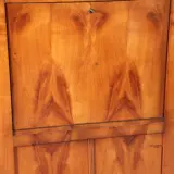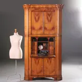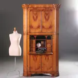 Blonde kersenhouten biedermeier hoekkast met 4 deuren en een klep, het geheel onder een gewelfde kroonlijst met uitkragende hoekjes, in de voet is een verglijkbare sprong verwerkt. Achter de klep met een “soft-open-systeem” een interieur met 6 kleine laden en een 5-tal opbergvakken, twee daarvan groot genoeg om een flinke laptop (40 X 32) te kunnen herbergen.