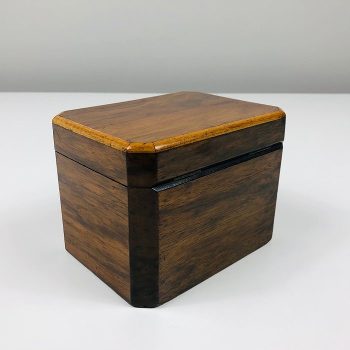 Theekistje uit de 19e eeuw en afkomstig uit Engeland. De bovenkant is ingelegd in citroenhout. Originele sleutel is er nog bij.