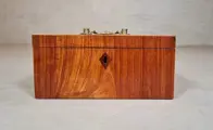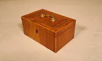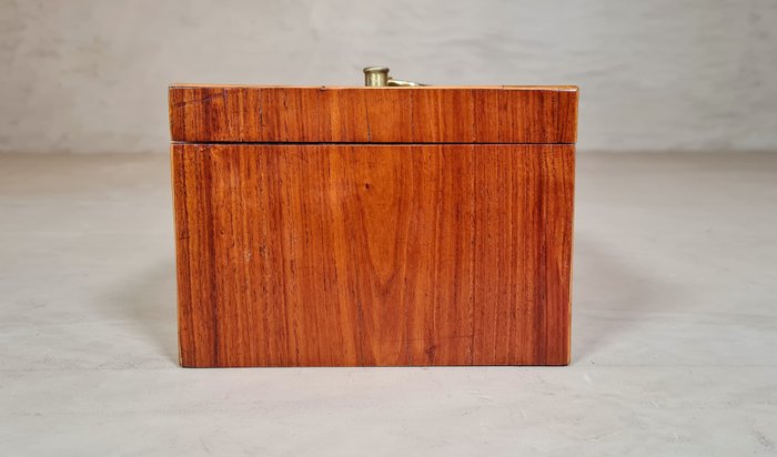 Een 18de eeuws kistje vervaardigd gedurende de Hollandse Louis XVI-periode omstreeks 1775-1795. Het theekistje is opgebouwd uit Eikenhout en belijmd met fineer van (Bahia) Rozenhout, randen en bieswerk van Buxus- & Ebbenhout en details van Padauk. Het kistje heeft op de deksel een verfijnd gegoten messing handgreepje met bloemrozetten als achterplaatjes. Het kistje draagt nog de originele messing scharnieren, het slotje functioneert niet en het slotoogje is ooit vervangen voor een exemplaar "uit de tijd". Aan het fineer & bieswerk zijn een paar oude, goed uitgevoerde en niet storende restauraties uitgevoerd. Het gehele kistje heeft prachtige warme contrasterende kleuren en een mooie zijdeglans!