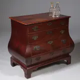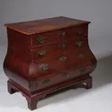 Een Hollandse laag gebombeerde mahonie rococo commode, vermoedelijk Den Haag. De indeling met 4 laden, op een gezaagde plint, het blad geprofileerd. Compleet met het oorspronkelijke beslag.