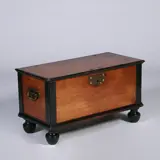 Koloniale kist uit voormalig Nederlands-Indië met bronzen beslag en grepen, staand op vier gedraaide gezwarte bolpoten. De profielen en de hoeken geaccentueerd met zwarte lijsten. Compleet met de oorspronkelijke gesmede sleutel.