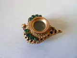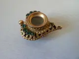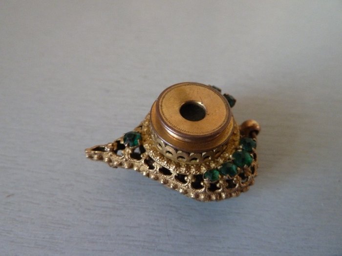 Goudkleurig metaal en groene strass-steentjes (er ontbreekt er een, maar die is heel gemakkelijk en tegen lage kosten te vervangen)