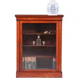 Engelse kleine boekenkast met één beglaasde deur, met het oorspronkelijke onregelmatige glas, dat zo’n charmante vertekening geeft. Het geheel op gesloten plint en met een licht uitkragend blad met een rechte rand, daaronder een geprofileerde lijst.