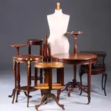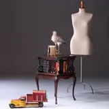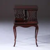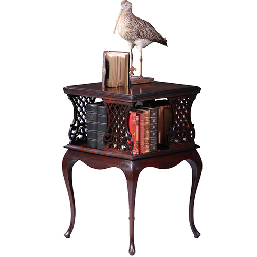 Donkerrood mahoniebijzettafel op hoge pootjes, de bovenkant in de vorm van een draaiend boekenkastje met 4 ajour gezaagde paneeltjes. Het bovenblad met een geprofileerde bladrand.