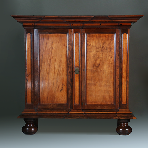 Een unieke tweedeurskast waarin massief palissander en djati op een sprekende wijze zijn gecombineerd. Dit indrukwekkend meubelstuk, waar de kwaliteit spreekwoordelijk vanaf spat, heeft prachtige subtiele details die dit robuuste meubel een aangename verfijning geven.