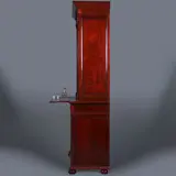 De afmetingen zijn opvallend maar de kwaliteit van dit meubel is ook bijzonder opvallend. Kosten nog moeite werden gespaard bij het maken van deze kast. Het massieve mahonie is bij overdreven kwistig gebruikt en verwerkt. De glans is formidabel, her en der is wat veroudering zichtbaar maar dat is minimaal voor een meubelstuk als dit. Twee aandachtspuntjes voor onze meubelmaker; De planken in de bovenkast zijn niet oorspronkelijk. Onze meubelmaker zal er de juiste weer bijmaken. En de linker deur klemt wat. Beide zaken worden uiteraard perfect verholpen, dit is bij de prijs inbegrepen, net als transport en plaatsing.