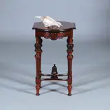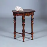 Willem III tafeltje in robuuste uitvoering en sierlijk gedetailleerd, het bovenblad met 2 boogvormige korte zijde, rustend op een onderstel van vier gedraaide poten onderling verbinden met een gebogen kruis en daarop, natuurlijk, een uitbundige pinakel. De poten versierd met gezwarte pilasters en met bladvormen gestoken bollen.