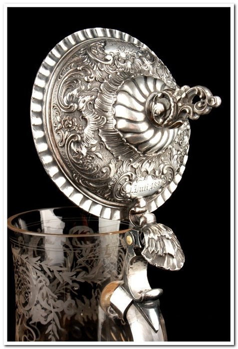 Een mooie grote mok met deksel van het WMF label. Gegraveerd glas. Verzilverde zetting. Duitsland rond 1900. Heel goede staat.