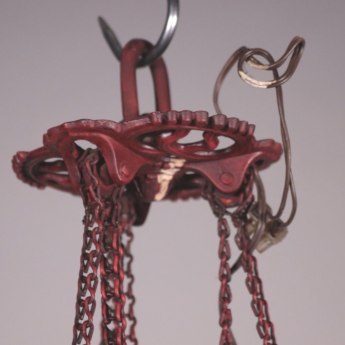 Kroonluchter waarvan de centrale gedraaide steel in gebeeldhouwd en verguld hout is, waaruit de zes metalen en plaatstalen armen vertrekken, om evenveel lichten te ondersteunen; het is versierd met glazen hangers en kettingen.