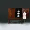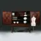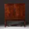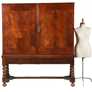 Vroeg kruisvoetkabinet 1680 – 1700 met de voor die tijd zeer kenmerkende rechte platte kroonlijst het geheel op een getorst onderstel. De sobere vorm met als uitbundigheid de rijk ingelegde platte deuren. Elke deur met een mozaïek van 12 punten goudenregen die samen een bloem vormen, afgebiesd met een ingelegd randje ebbenhout. Afhankelijk van de lichtval vormen de 12 punten soms ook 6 hartjes die met de punten naar elkaar wijzen. In de hoeken van de deuren zijn telkens drie punten aangebracht. De binnenzijde van de deuren met ingelegde sterpatronen die prachtig afsteken tegen de donkere palissander ondergrond.
