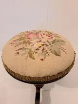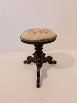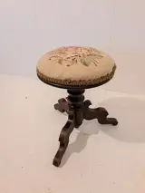 Mooie klassieke en zeer decoratieve piano kruk. In prima werkende staat (verstelbaar in hoogte)met gebruikerssporen passend bij de leeftijd.De zitting heeft een geborduurde bekleding.