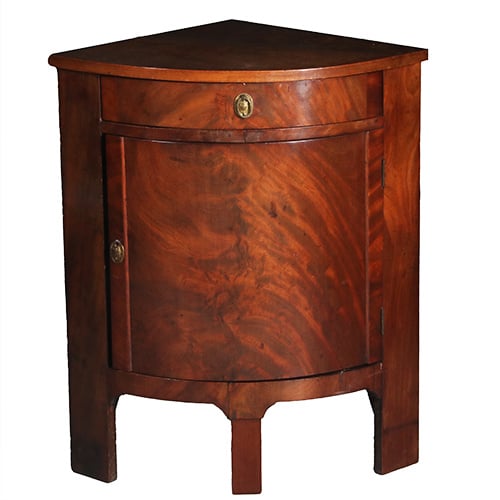 Hollands vroeg Biedermeier hoekkastje het gebogen deurtje en de kwart ronde lade zijn met bloemmahonie prachtig en sprekend afgewerkt. Het geheel op drie pootjes.