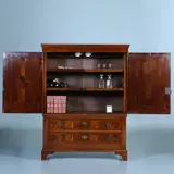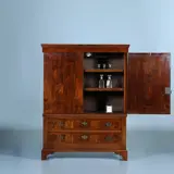 Hollands luierkabinet in noten, wortelnoten en goudenregen, eind 17 e eeuw met prachtig inlegwerk, ook op de binnenzijde dan de deuren. Verglijkbare meubelen werden in Engeland gemaakt de William & Marry periode De deuren en zijpanelen met marqueterie van o.a. 8 stervormige bloemrozetten. In de onderkast twee laden. Het geheel op een gecontourneerde plint.