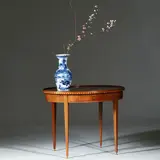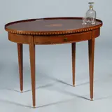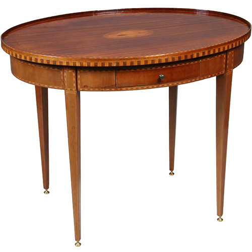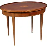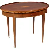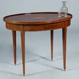 Hollands Louis Seize stijl ovale theetafel met een lade met bronzen knopje. Staand op vier tapse poten met marqueterie afgebiesd en op kleine bronzen bolpootjes. Het tafelblad met een kleine opstaande rand met geblokte ingelegde rand. In het centrum een ovaal medaillon met een ingelegde schelp.