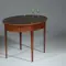 Hollands Louis Seize stijl ovale theetafel in mahonie met een lade met een afsluitbare lade. Staand op vier tapse poten met ingelegde satijnhouten driehoekjes. Het gespiegelde tafelblad met een opstaande rand met geblokte ingelegde rand, aan de bovenzijde met een marqueterie “kabeltje” afgewerkt.