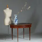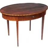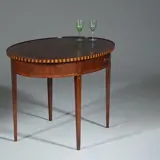 Hollands Louis Seize stijl ovale theetafel in mahonie met een lade met een afsluitbare lade. Staand op vier tapse poten met ingelegde satijnhouten driehoekjes. Het gespiegelde tafelblad met een opstaande rand met geblokte ingelegde rand, aan de bovenzijde met een marqueterie “kabeltje” afgewerkt.