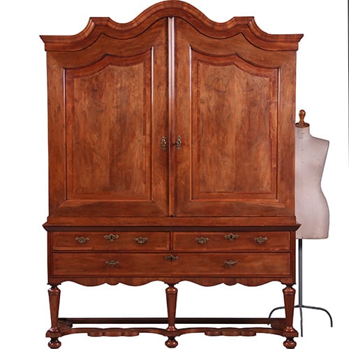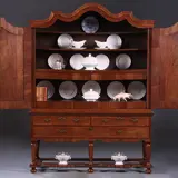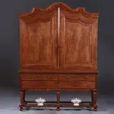 Hollands vroeg 18 e eeuws kruisvoetkabinet op sluierpoten, onder een gewelfde kroonlijst, onder de eveneens gewelfde deuren een onderkast met 3 laden, het geheel op 5 poten, onderling verbonden met geslingerde regels, de achterste recht. De voorste regels met een console voor om twee Chinese kommen te pronk te zetten.