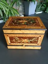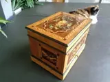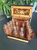 Likeurkelder met prachtig inlegwerk, compleet met 16 kristallen glazen en 4 karaffen. van oorsprong.