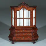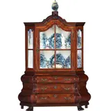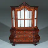 Miniatuur rococostijl kabinet/ porseleinkast met, dubbel gebogen en met schuine zijkanten, in de onderkast drie laden met fraai in schaal gemaakte bronzen ladengrepen. De bovenkast met een deurtje met roedeverdeling afsluitbaar met een minuscuul sleuteltje. De gewelde kap met ruimte voor een miniatuur kaststel. Het geheel staand op gedetailleerd gesneden klauwpootjes.