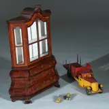 Hier hebben generaties kinderen waarschijnlijk met de handjes op de rug alleen maar naar mogen kijken. Het miniatuur kabinet maakt namelijk beslist geen “bespeelde indruk”, kleine normale sporen van veroudering, de witte beschildering aan de binnenzijde met wat verkleuring, achterpaneeltje onderkast gerestaureerd en stofdicht gemaakt met een gegomd strookje. Compleet met sleuteltje op een werkend slotje.