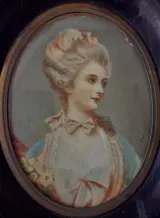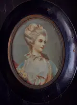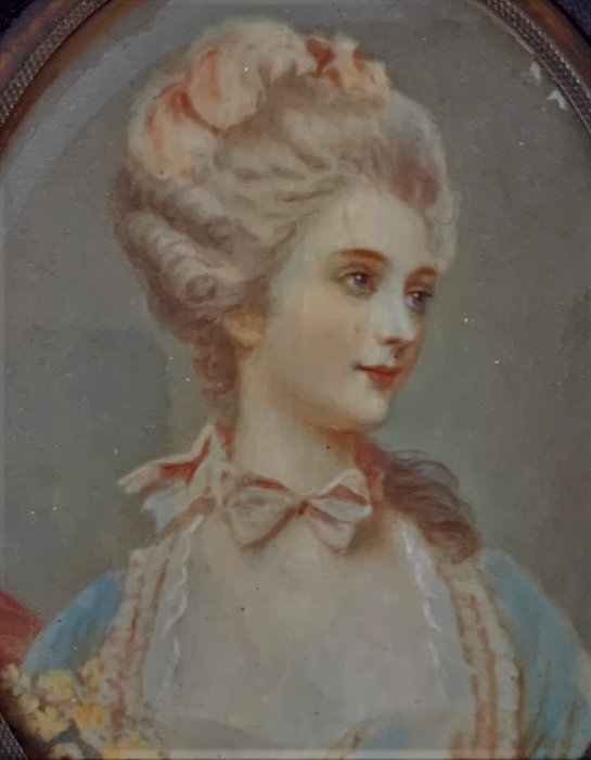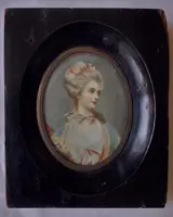 Driekwart miniatuur voorstellende een jonge edelvrouw in achttiende-eeuwse kleding en kapsel. Opmerkelijke aandacht voor detail, handtekening van de auteur leesbaar langs de rechterrand. Perkamenten ovaal met houten lijst en bronzen ring. 9x6cm ovaal, 14x12 met lijst.