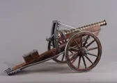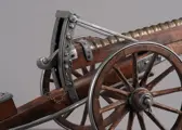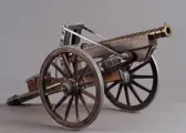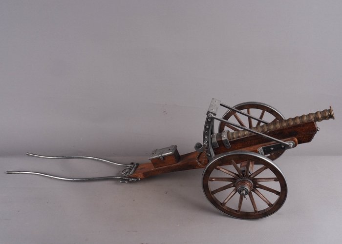 Groot formaat bronzen tafelkanon op houten affuit, met draaiende houten wielen en metalen burries of lamoen voor een paarden inspanning. Het kanon is in hoogte verstelbaar. Alleen voor decoratieve doeleinden. hoogte 20 cm, lengte 44 cm, met uitgeklapte lamoen 65 cm.