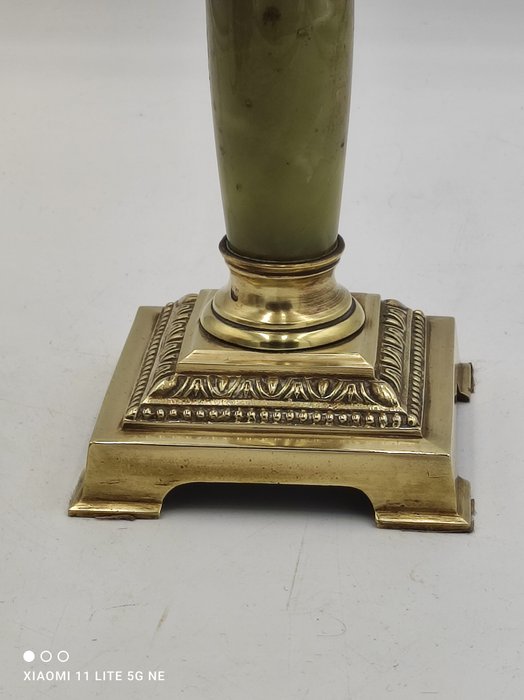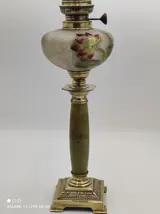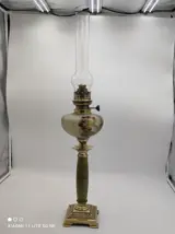 Prachtige kerosinelamp met zijn messing voet, onyx kolom, huis geschilderde tank.