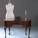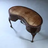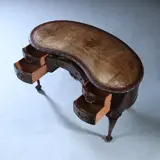 Mahoniehouten niervormig Chippendale stijl bureau ingelegd met fraai doorleefd leer, de bladrand rondom met een klein steekwerkje afgewerkt. Aan de zijkanten elk twee bol gebogen laden, een hol gebogen lade in het midden. Het geheel staand op 4 gebogen poten eindigend in een klauwpootje rusten op een bol.