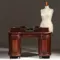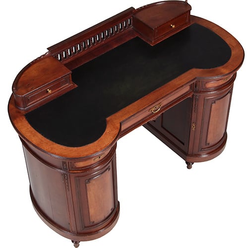 Niervormig bureau van bescheiden formaat met kleine opstand, daarin draaiende laden en een ajour gezaagde achterregel. Het schrijfvlak met strak zwart leer ingelegd. De rondlopende zijkasten verbergen elk een handige opbergruimte, links een paar plankjes, rechts een drietal uittrekbare dossier plankjes met ingewerkte grepen. Onder het blad drie laden. De middelste recht en de zijladen rondlopend zoals de kastjes.