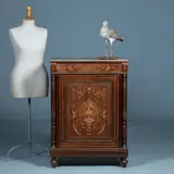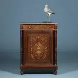 Frans palissander 1-deurkastje met een gedetailleerd intarsia paneel en fries. De hoeken geflankeerd met gedraaide zuilen met cannelures en bronzen details. Ook de profiellijsten zijn in brons uitgevoerd. Op het bovenblad met roodbruin geaderd marmerblad gevat in een bronzen lijst. Het geheel rustend op vier gedraaide bolpootjes.