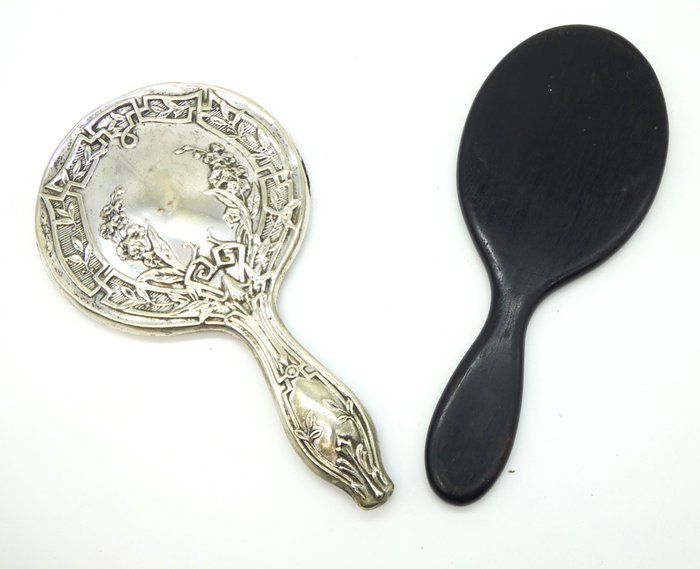 Het andere model is van zilverkleurig metaal in reliëf met bloemendecoraties in reliëf, in art-nouveaustijl en -periode (datum tussen eind 1800 en begin 1900). Het stuk is zeer elegant, met een mooie afgeschuinde spiegel in een goede staat van bewaring. We zien echter op het zilverkleurige metalen deel dat ter hoogte van de contour van de spiegel een beetje gedeukt is en dat de lasnaad op sommige plaatsen is geopend (zie foto's). Afmetingen: circa 24 cm hoog x 13 cm breed.