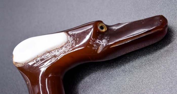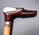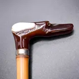 Oude wandelstok van hout met een handvat in de vorm van een hond.