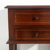 Paar nachtkastjes, D. Maria-stijl, in mahonie en andere houtsoorten, romp met twee laden, ingelegde decoratie met lijstwerk. Portugees, 20e eeuw. Afmetingen: 74x50x36 cm. In goede algemene staat.