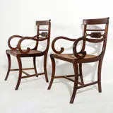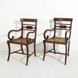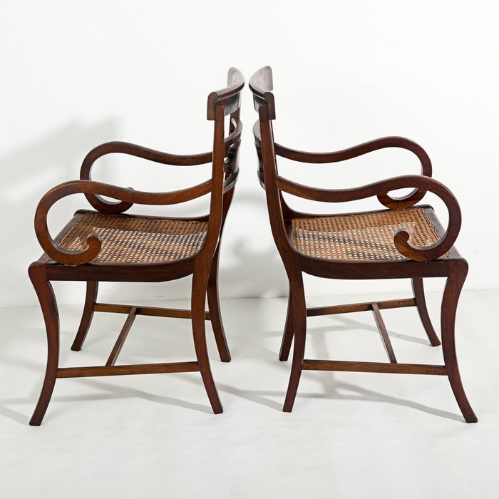 Paar fauteuils, Willem IV-stijl, mahoniehout. Rugleuningen met horizontale middentafels gesneden met inlays, rieten zittingen, draaibare armen, gebogen poten verbonden door vergrendeling in H. Portugees. 20ste eeuw.